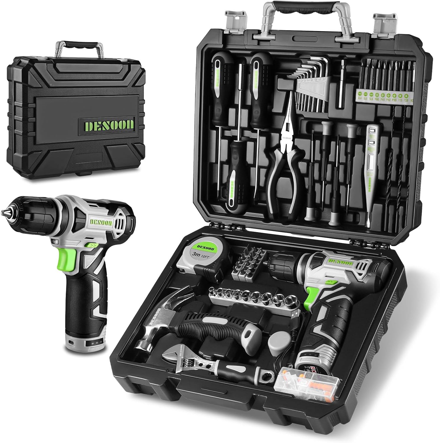 Lo que más me ha gustado de la caja de herramientas DESOON es su versatilidad y el valor que ofrece por el precio. La inclusión de un taladro eléctrico sin cuerda de alta calidad, junto con una amplia variedad de herramientas manuales, hace de este kit un valor excepcional para cualquier persona que busque una caja de herramientas completa para proyectos de bricolaje y reparaciones en el hogar.
